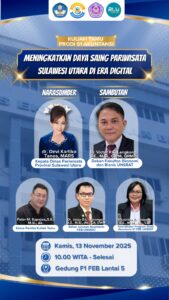 MANADO 13/11/2025 – Bertempat di Gedung F1 Fakultas Ekonomi dan Bisnis Universitas Sam Ratulangi (FEB UNSRAT) Lantai 5, Program Studi S1 Akuntansi FEB UNSRAT menyelenggarakan Kuliah Tamu Bisnis Pariwisata dengan tema “Meningkatkan Daya Saing Pariwisata Sulawesi Utara di Era Digital”.
