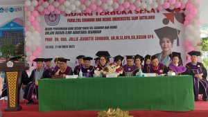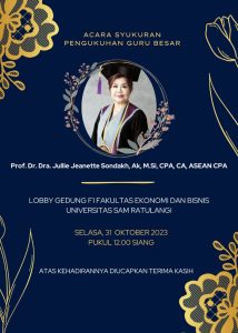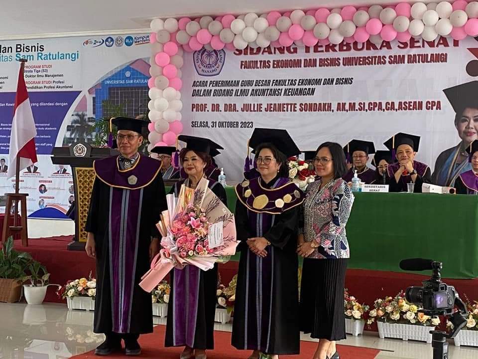 Selasa, 31 Oktober 2023 melalui sidang senat Perguruan tinggi Universitas Sam Ratulangi dosen jurusan akuntansi Fakultas Ekonomi dan Bisnis Prof. Dr. Dra. Jullie Jeanette Sondakh.,Ak.,MSi.,CPA.,CA.,ASEAN.CPA menjadi salah satu dosen yang dikukuhkan sebagai guru besar atau Profesor dari 11 dosen Unsrat yang dikukuhkan. Prof. Dr. Dra. Jullie Jeanette Sondakh.,Ak.,MSi.,CPA.,CA.,ASEAN.CPA di kukuhkan sebagai guru besar bidang ilmu akuntansi keuangan, dengan demikian jurusan akuntansi FEB Unsrat pada saat ini memiliki 4 Guru Besar yaitu Prof. Dr. David Paul Elia Saerang,SE.,MCom.Hons., Prof.Dr. Winston Pontoh,SE.,MM.,Ak.,CA dan Prof. Dr. Herman Karamoy,SE.,MSi.,Ak.,CA.